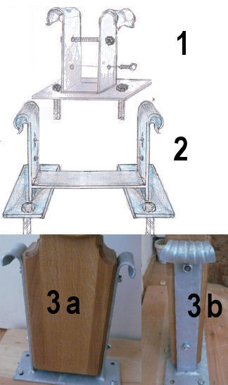 FASTENINGThe fastening is the connection between the wooden tomb or grave cross and the concrete foundationThey are all hand-forged, galvanized or hot zinc dipped. The tomb or grave cross must be only fixed with its holder on the concrete foundation with 2 or - depending from the weight - 4 screws. The holders fixes the wodden bottom side from the tombs and grave crosses, so they have a ground clearance with about one inch, so that the wood can not rotten. Nr.1 shows the fastenig for normal grave crosses or crucifixes (till to size about 100 inch. Nr.2 is an examble of an holder for very heavy tombs. The fastening is fixed on the concrete foundation with four screws and dowels or with glued in threaded rods and four nuts with flat washers. The weight from the tomb rest on the horizontal connection between the two vertical legs. Nr.3a +Nr.3b The photos shows the holder for an cross with an size from 71 inch from front view and side.view. My firm offer includes this handmade holder or fastening.